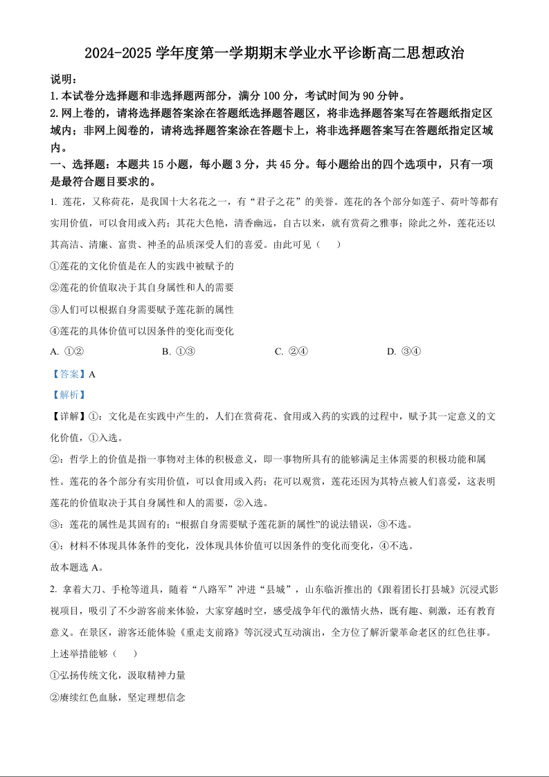 山东省烟台市2024-2025学年上学期1月高一期末考试政治(解析版)