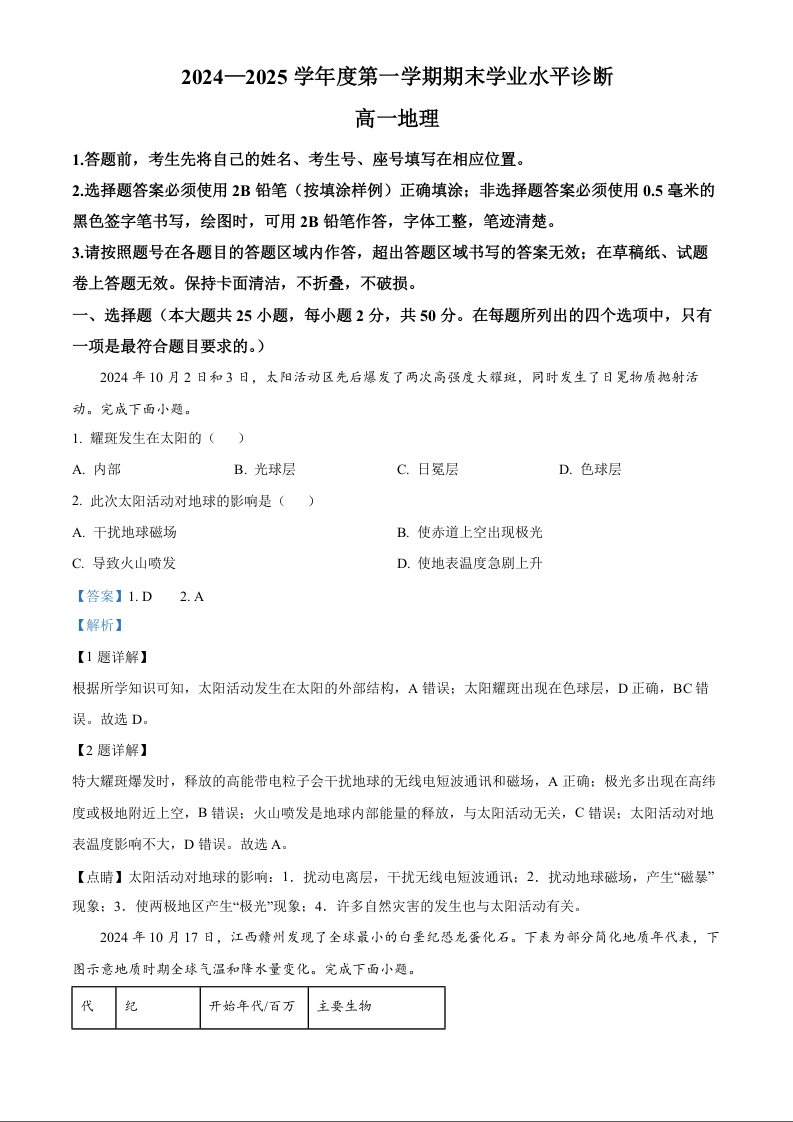 山东省烟台市2024-2025学年上学期1月高一期末考试地理(解析版)