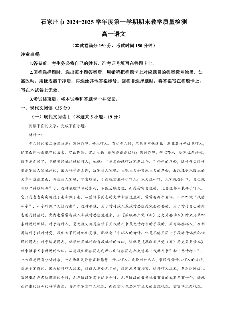 河北省石家庄市2024-2025学年高一上学期期末考试生物语文(解析版)