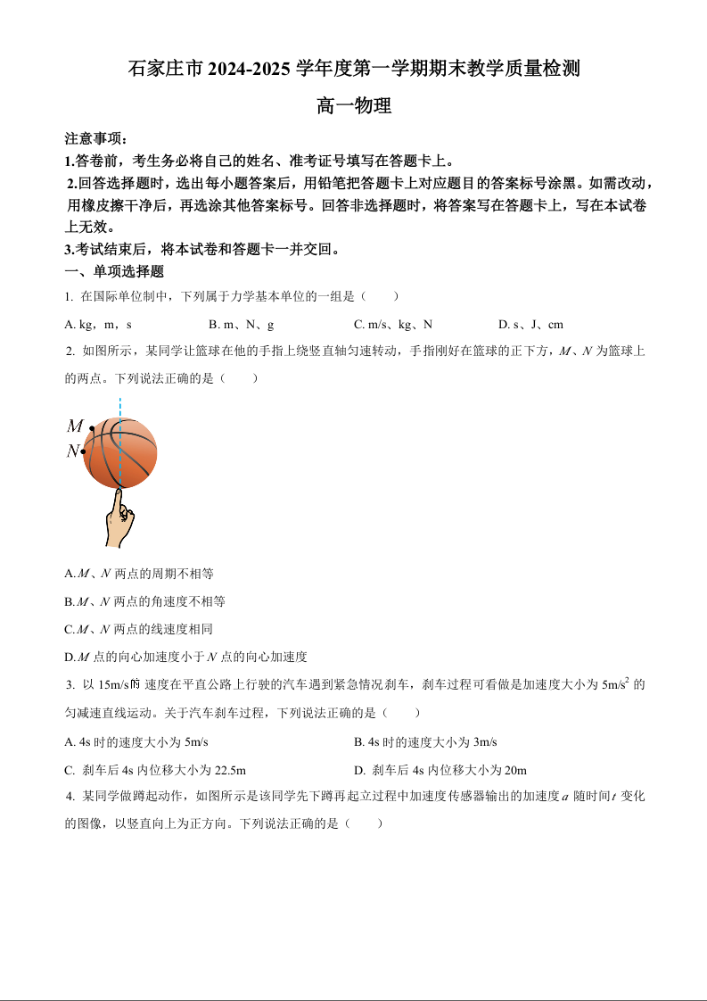 河北省石家庄市2024-2025学年高一上学期期末考试物理+答案