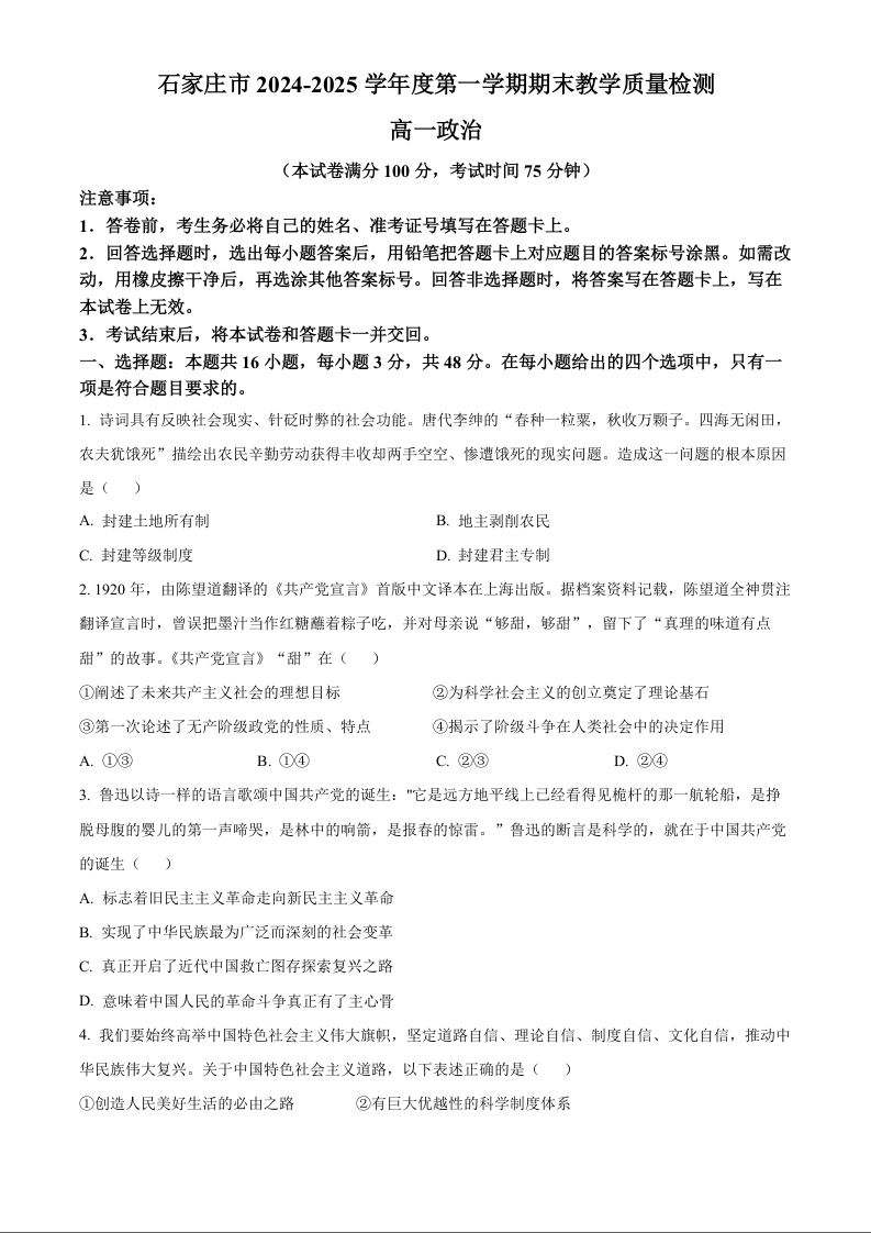 河北省石家庄市2024-2025学年高一上学期期末考试生物政治(原卷版)