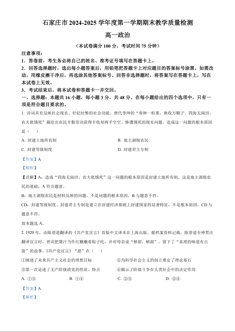 河北省石家庄市2024-2025学年高一上学期期末考试生物政治(解析版)
