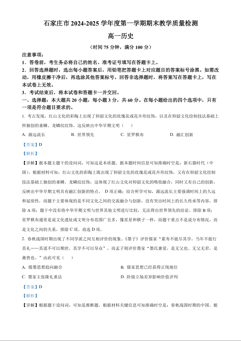 河北省石家庄市2024-2025学年高一上学期期末考试历史(解析版)