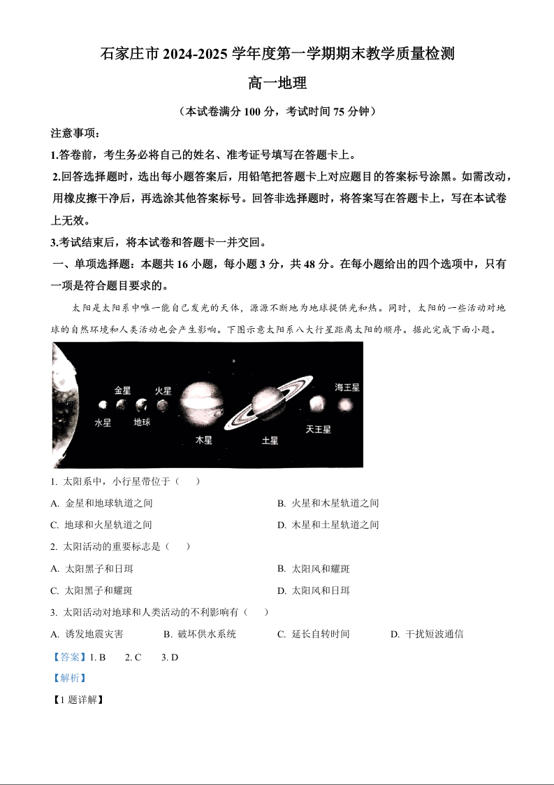 河北省石家庄市2024-2025学年高一上学期期末考试地理(解析版)