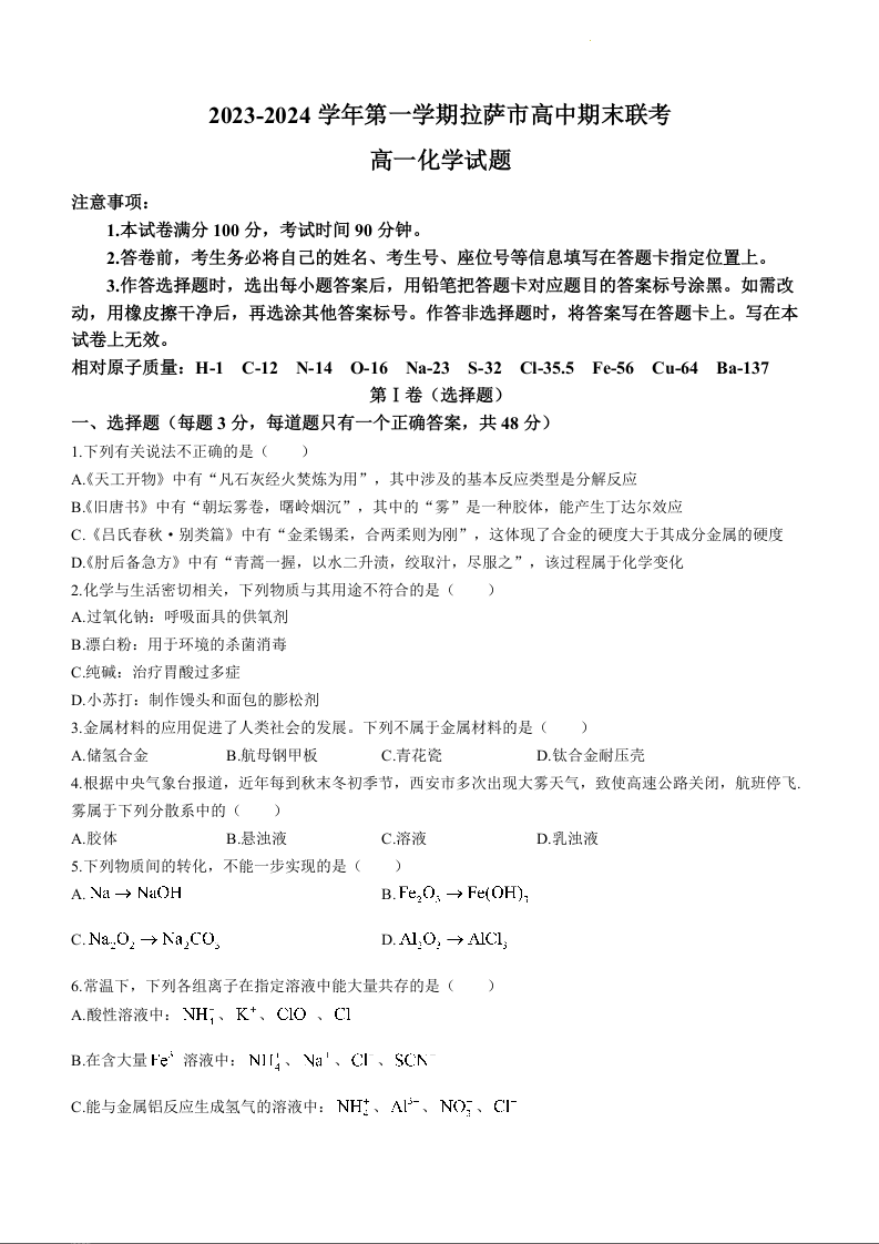 西藏自治区拉萨市2023-2024学年高一上学期12月期末联考化学