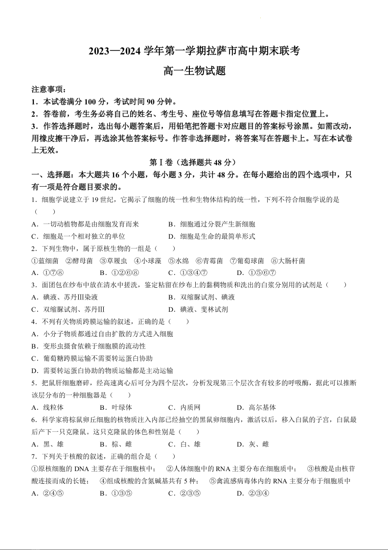 西藏自治区拉萨市2023-2024学年高一上学期12月期末联考生物