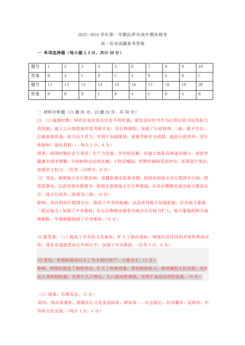 西藏自治区拉萨市2023-2024学年高一上学期12月期末联考历史答案