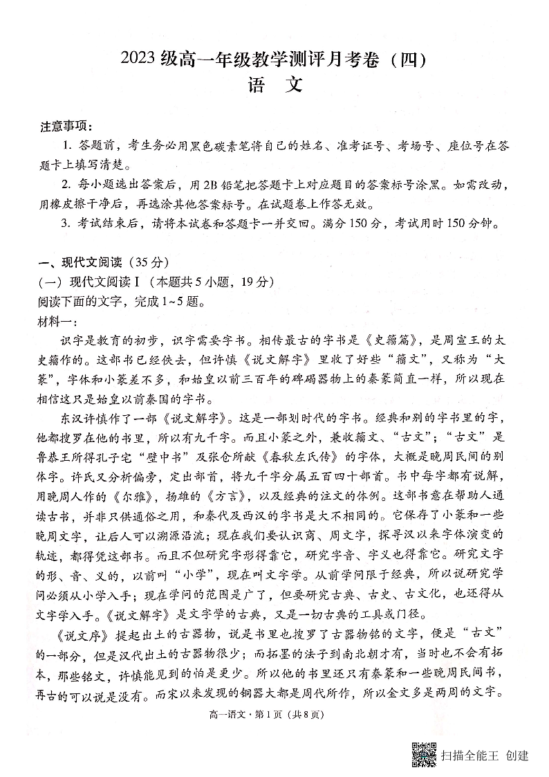 云南省昆明市云南师范大学附属中学2023-2024学年高一上学期12月月考语文