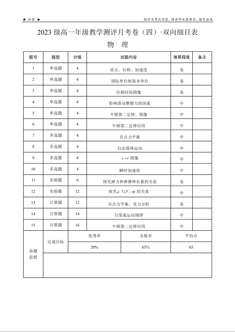 云南省昆明市云南师范大学附属中学2023-2024学年高一上学期12月月考物理双向细目表