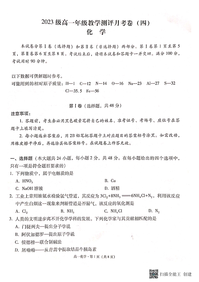 云南省昆明市云南师范大学附属中学2023-2024学年高一上学期12月月考化学