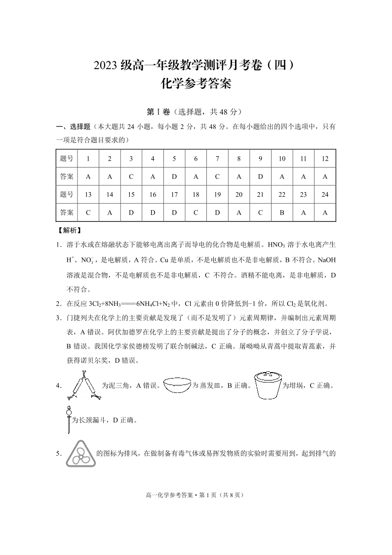 云南省昆明市云南师范大学附属中学2023-2024学年高一上学期12月月考化学答案