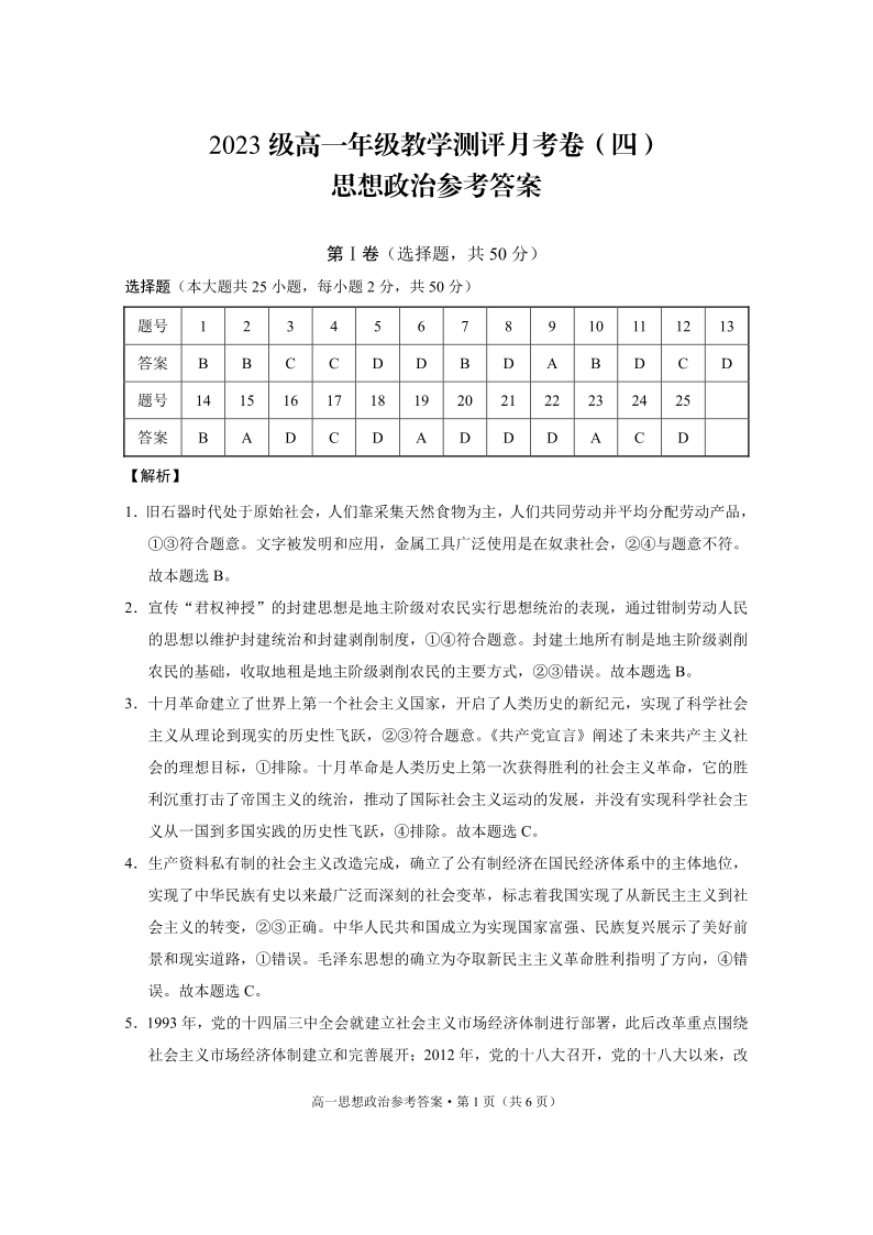 云南省昆明市云南师范大学附属中学2023-2024学年高一上学期12月月考政治答案