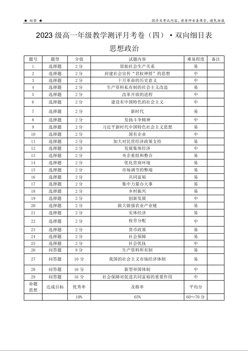 云南省昆明市云南师范大学附属中学2023-2024学年高一上学期12月月考政治双向细目表