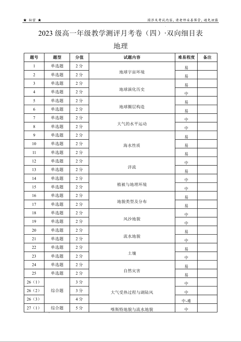 云南省昆明市云南师范大学附属中学2023-2024学年高一上学期12月月考地理·双向细目表