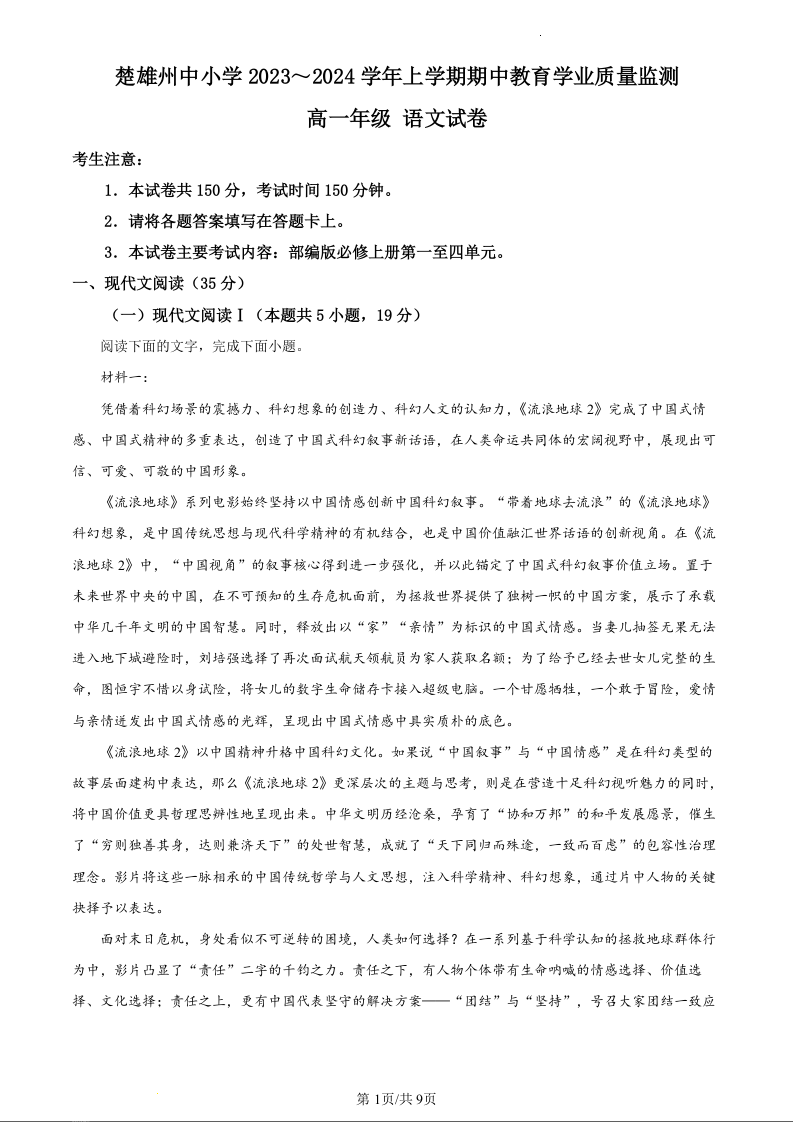 云南省楚雄州2023-2024学年高一上学期期中考试语文(原卷版)