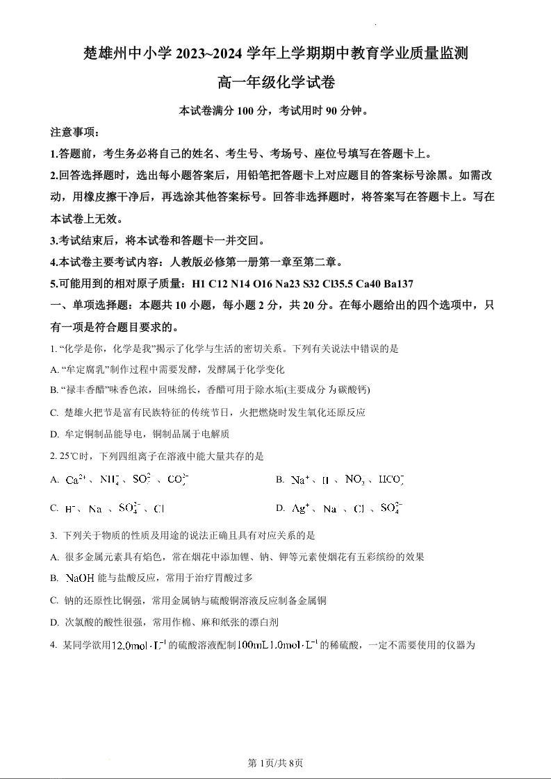 云南省楚雄州2023-2024学年高一上学期期中考试化学(原卷版)