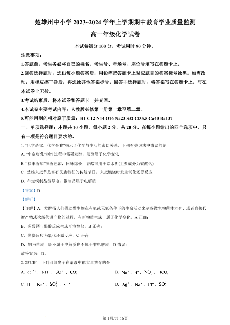 云南省楚雄州2023-2024学年高一上学期期中考试化学(精品解析版)