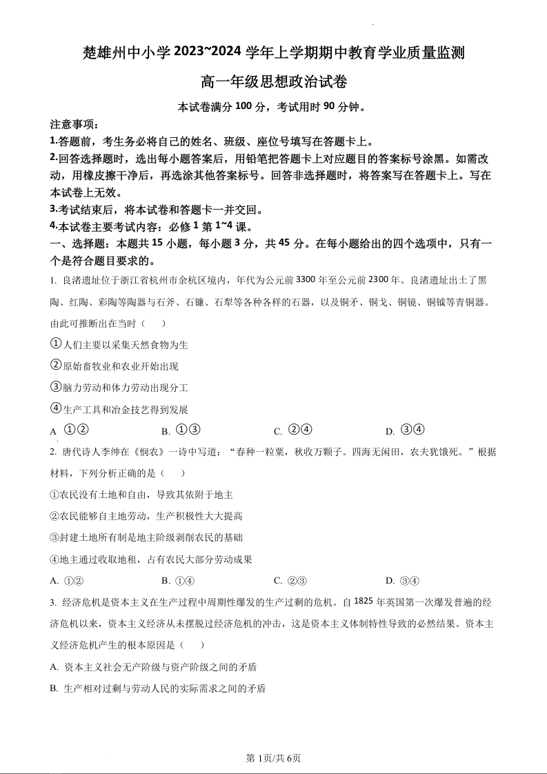 云南省楚雄州2023-2024学年高一上学期期中考试政治(原卷版)