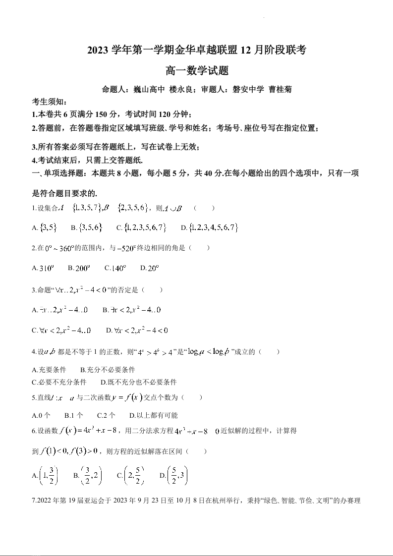 浙江省杭州市精诚联考2023-2024学年高一上学期12月月考数学