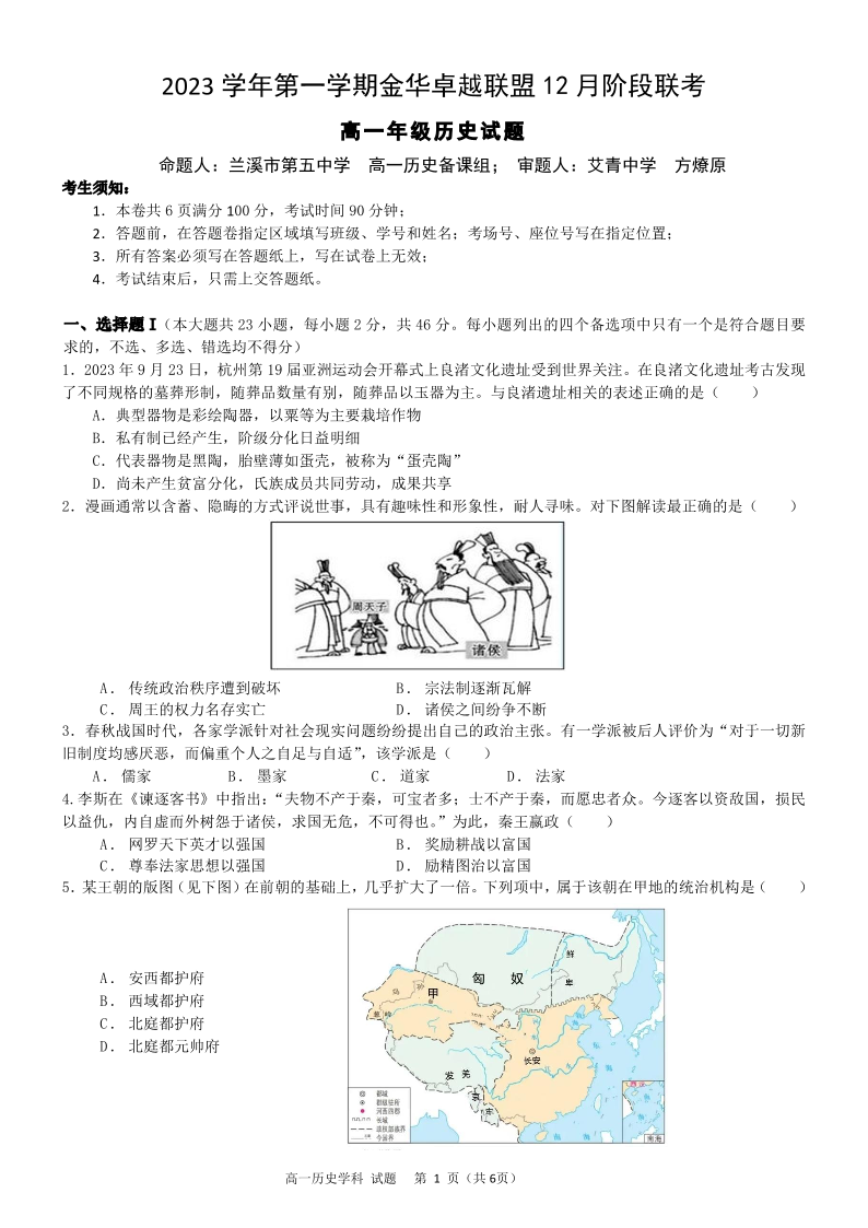 浙江省杭州市精诚联考2023-2024学年高一上学期12月月考历史