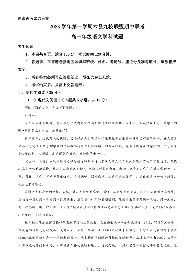 浙江省杭州市六县九校联盟2023-2024学年高一上学期期中联考数学语文(精品解析版)