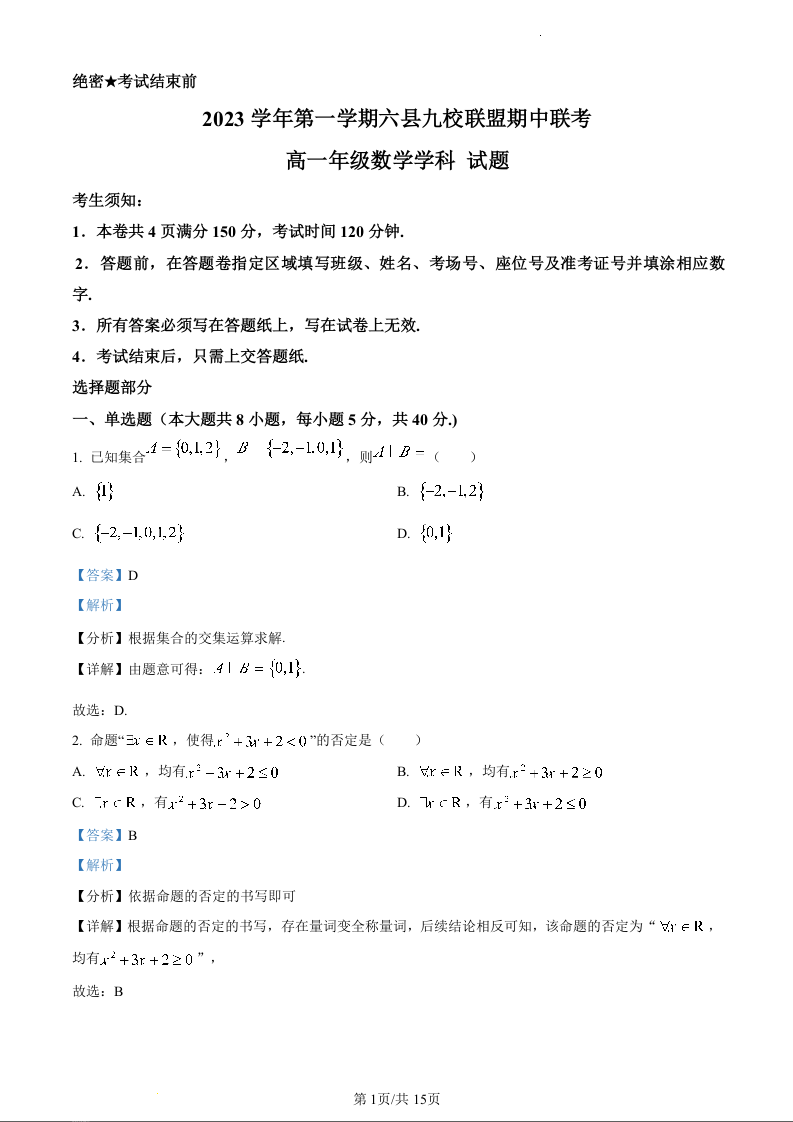 浙江省杭州市六县九校联盟2023-2024学年高一上学期期中联考数学(精品解析版)