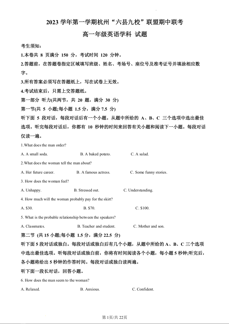 浙江省杭州市六县九校联盟2023-2024学年高一上学期期中联考数学英语(精品解析版)