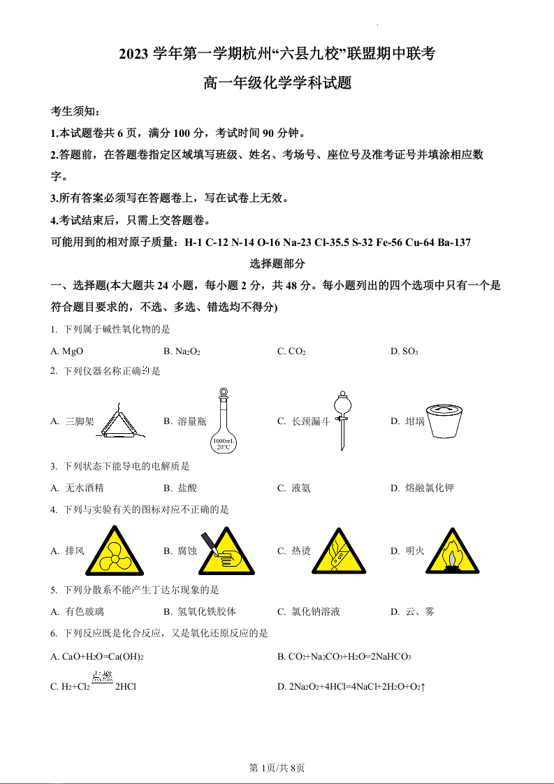 浙江省杭州市六县九校联盟2023-2024学年高一上学期期中联考化学(原卷版)