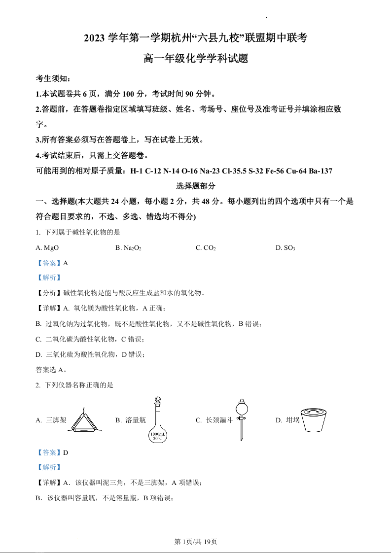 浙江省杭州市六县九校联盟2023-2024学年高一上学期期中联考化学(精品解析版)