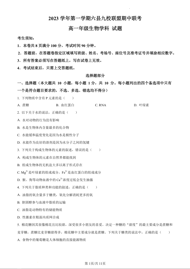 浙江省杭州市六县九校联盟2023-2024学年高一上学期期中联考数学生物(原卷版)