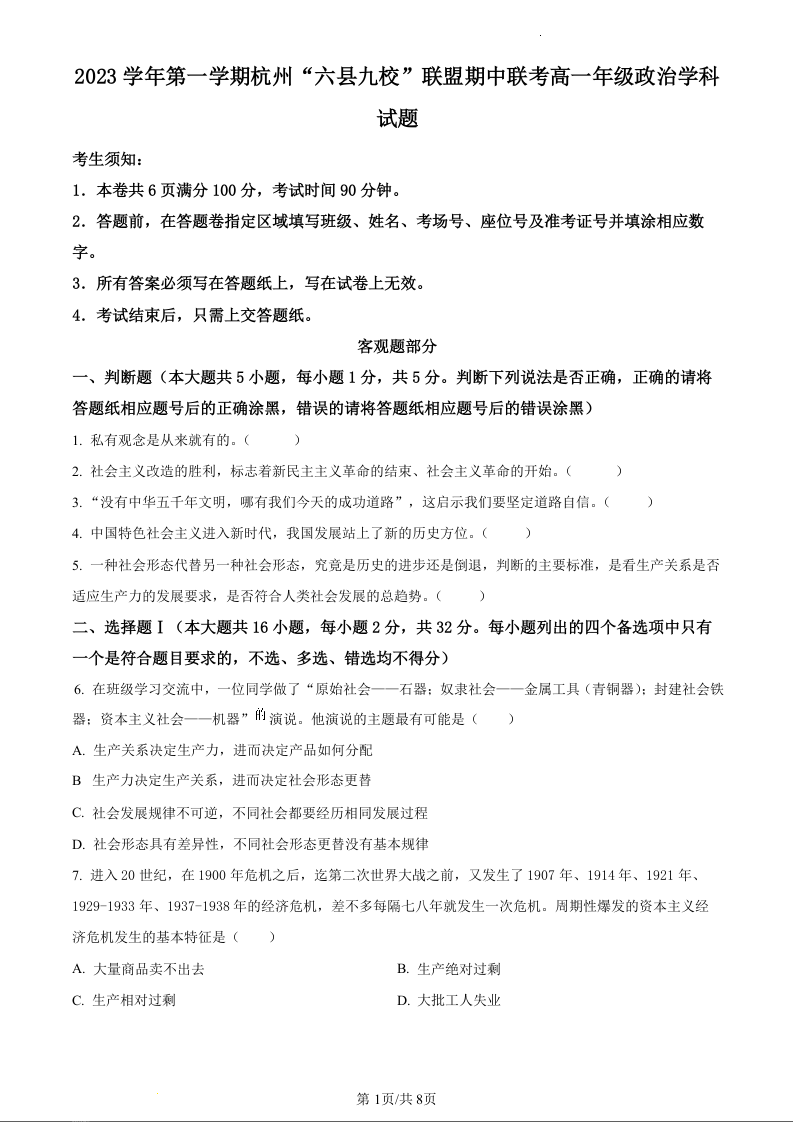 浙江省杭州市六县九校联盟2023-2024学年高一上学期期中联考数学政治(原卷版)
