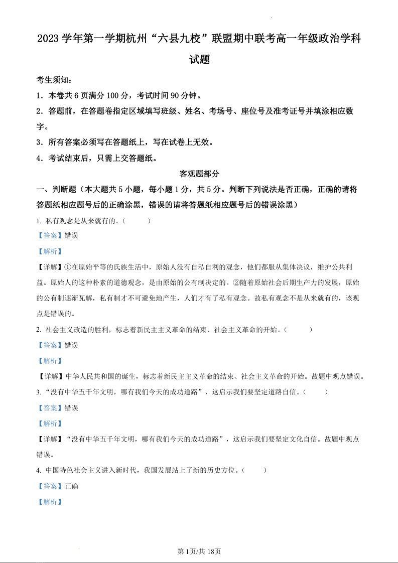 浙江省杭州市六县九校联盟2023-2024学年高一上学期期中联考数学政治(精品解析版)