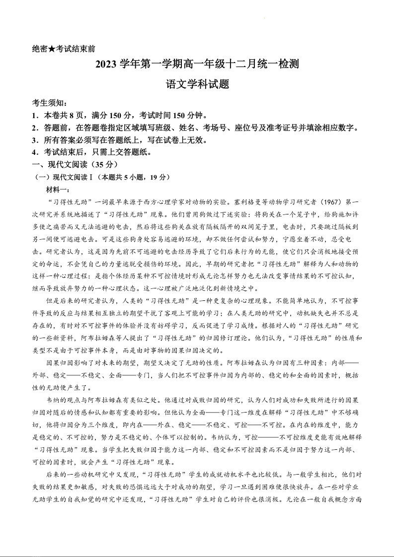浙江省湖州市安吉县2023—2024学年高一年级上学期12月月考语文