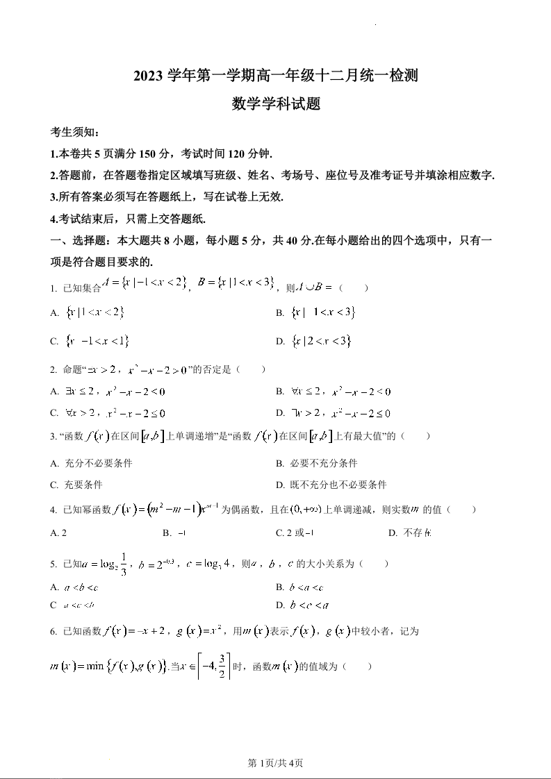 浙江省湖州市安吉县2023—2024学年高一年级上学期12月月考数学(原卷版)