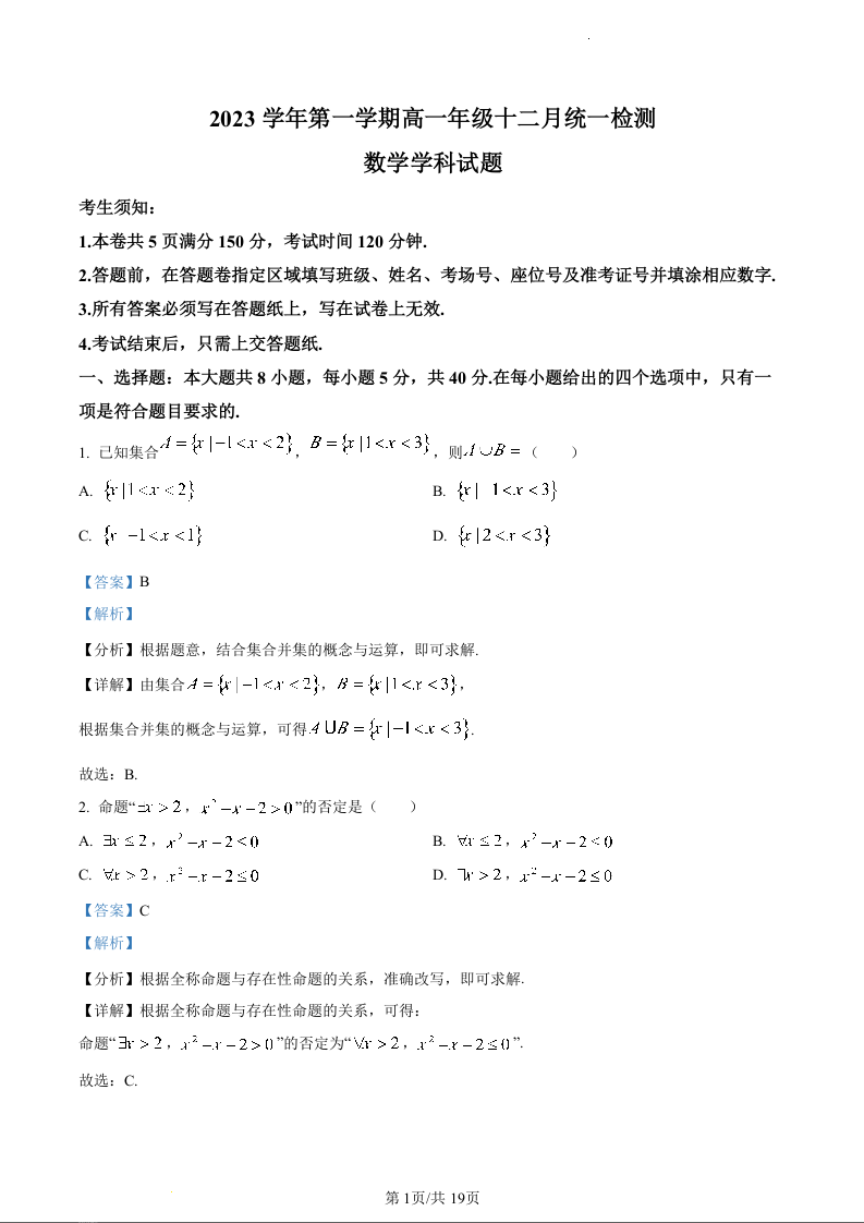 浙江省湖州市安吉县2023—2024学年高一年级上学期12月月考数学(精品解析版)