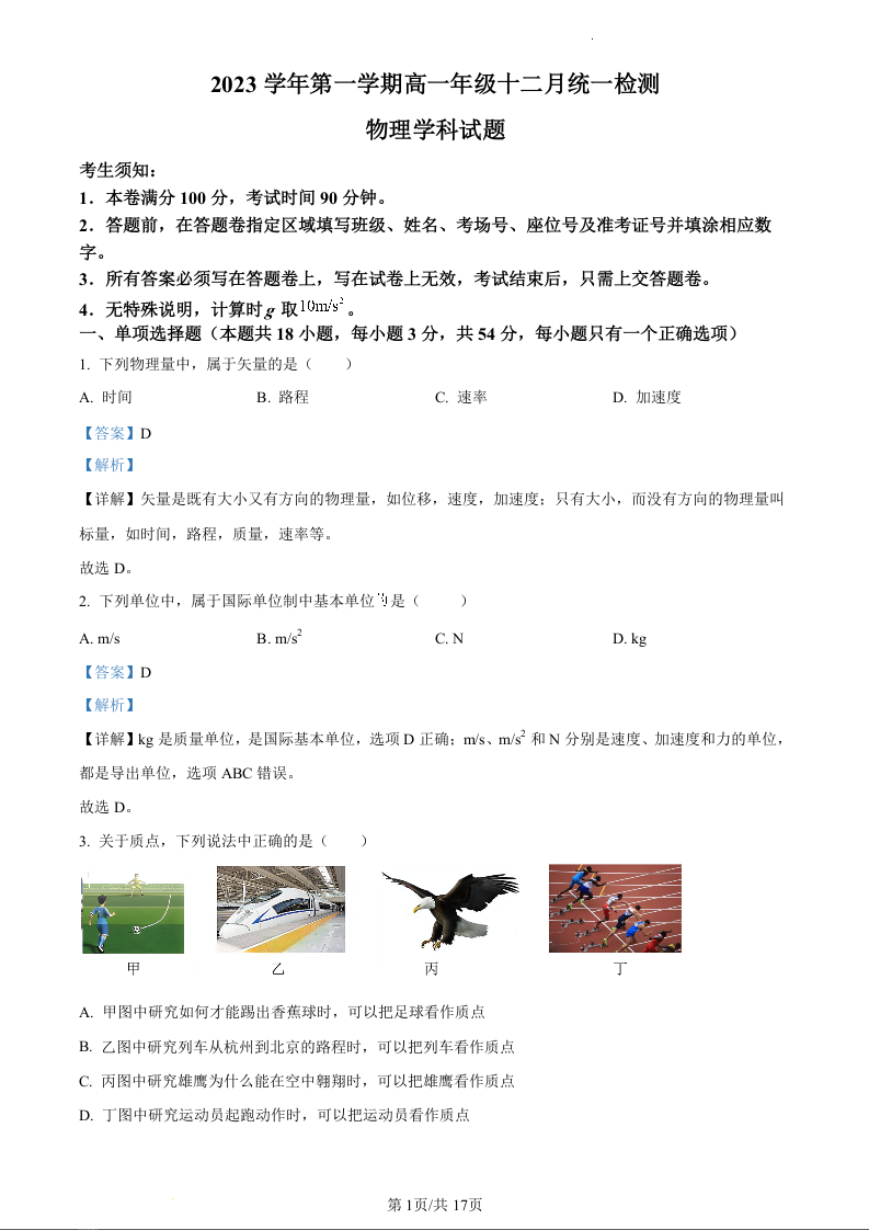 浙江省湖州市安吉县2023—2024学年高一年级上学期12月月考物理(精品解析版)