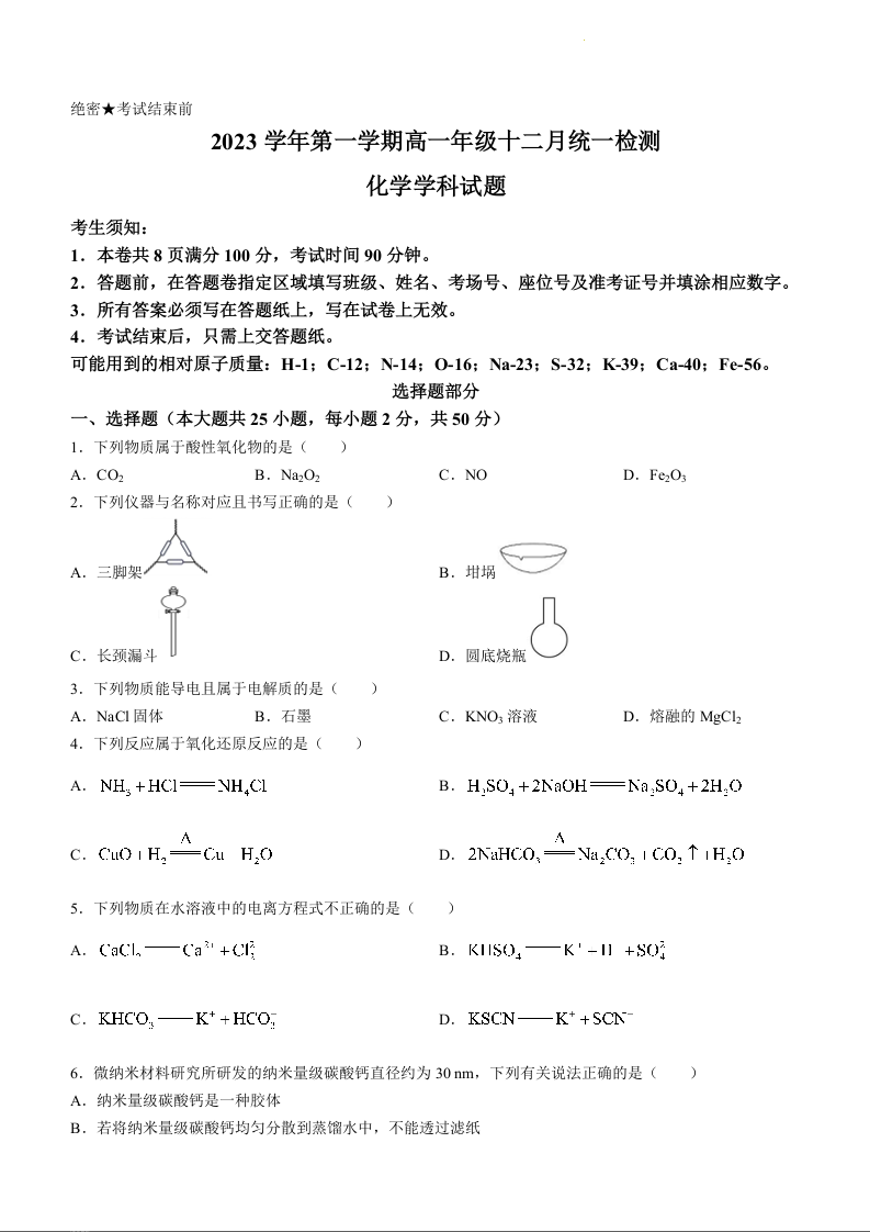 浙江省安吉县2023-2024学年高一上学期12月统一检测化学