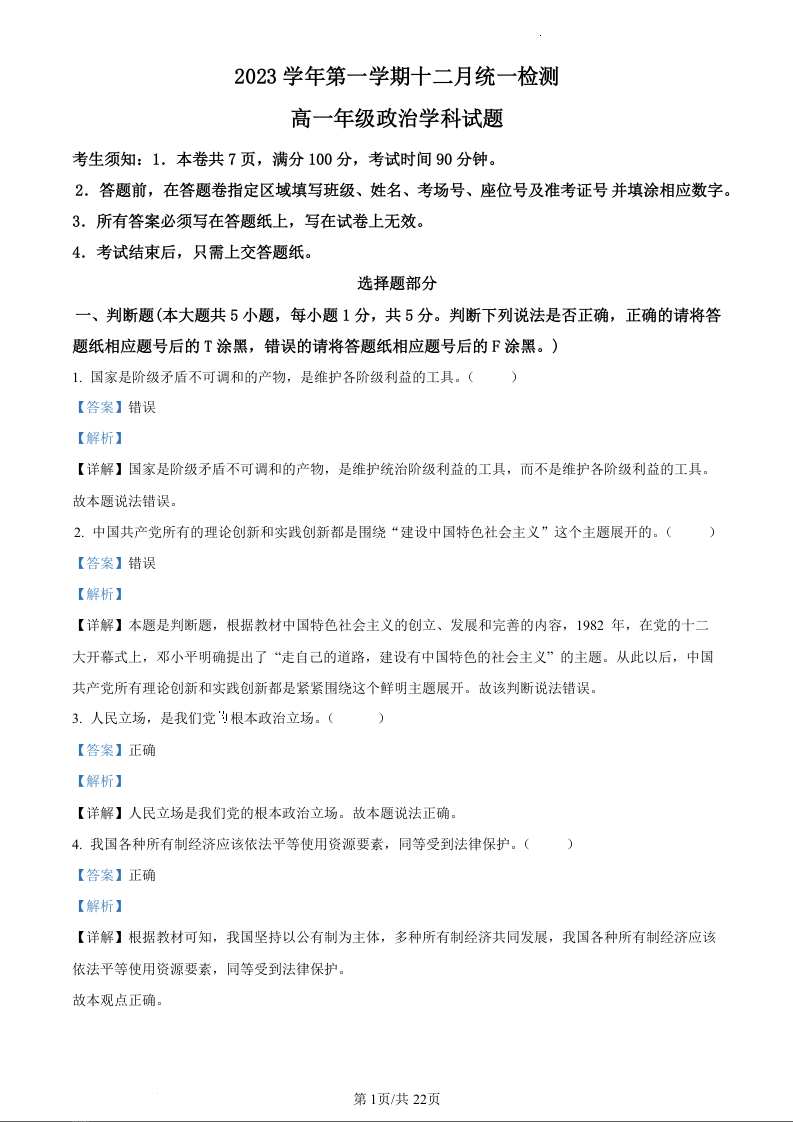 浙江省湖州市安吉县2023—2024学年高一年级上学期12月月考政治 (精品解析版)