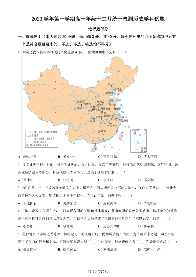 浙江省湖州市安吉县2023—2024学年高一年级上学期12月月考历史(原卷版)