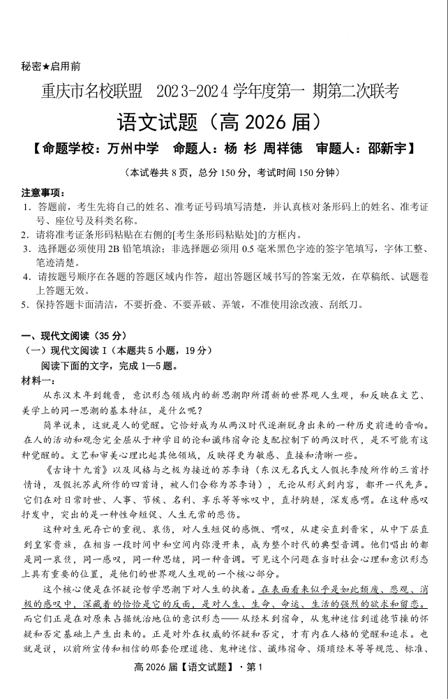 重庆市名校联盟2023-2024学年高一上学期12月联考语文