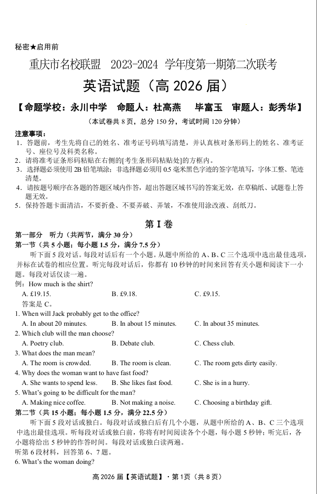 重庆市名校联盟2023-2024学年高一上学期12月联考英语