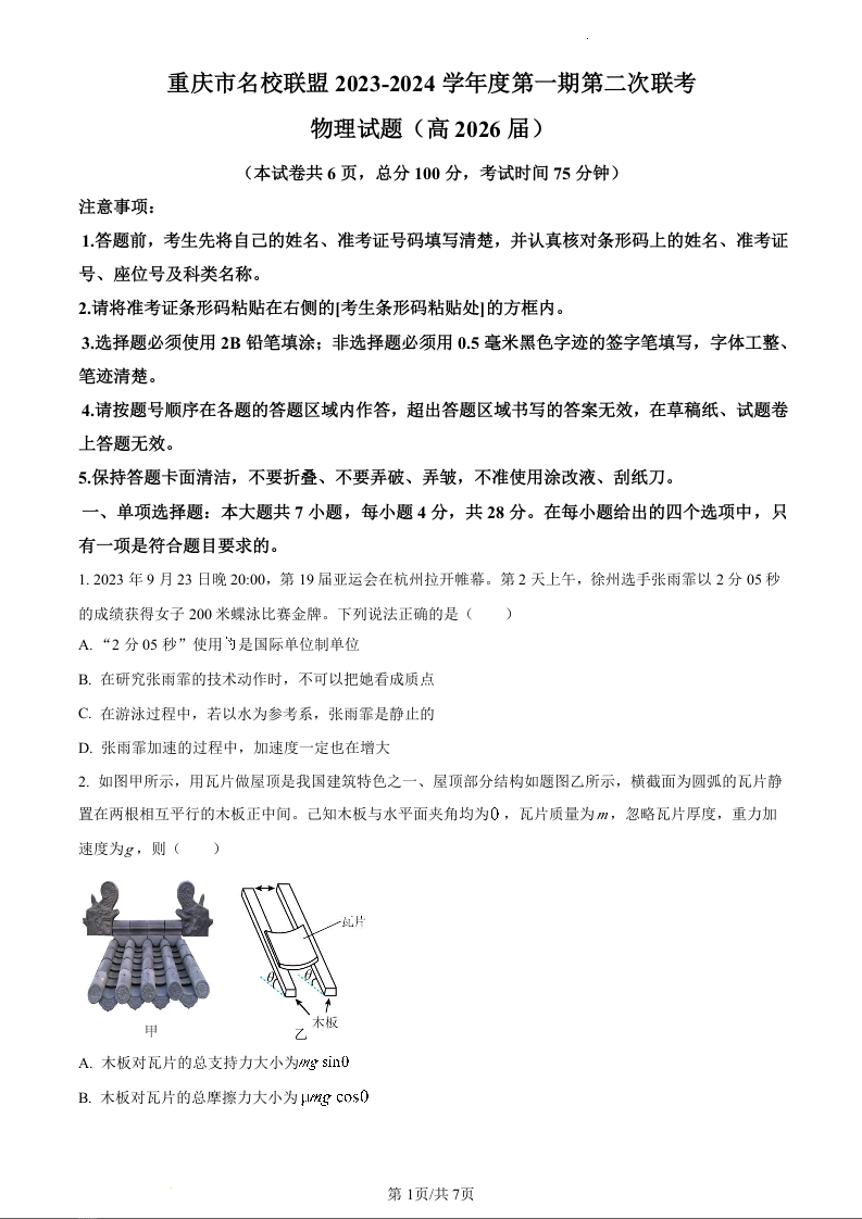 重庆市名校联盟2023-2024学年高一上学期12月联考物理(原卷版)