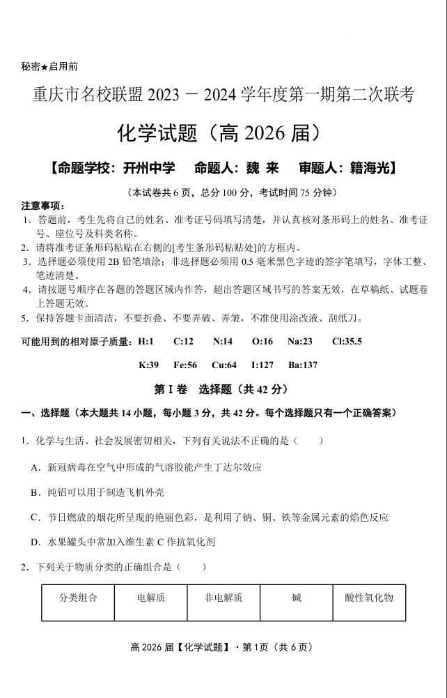 重庆市名校联盟2023-2024学年高一上学期12月联考化学