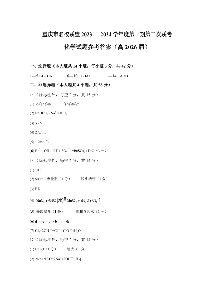 重庆市名校联盟2023-2024学年高一上学期12月联考化学答案