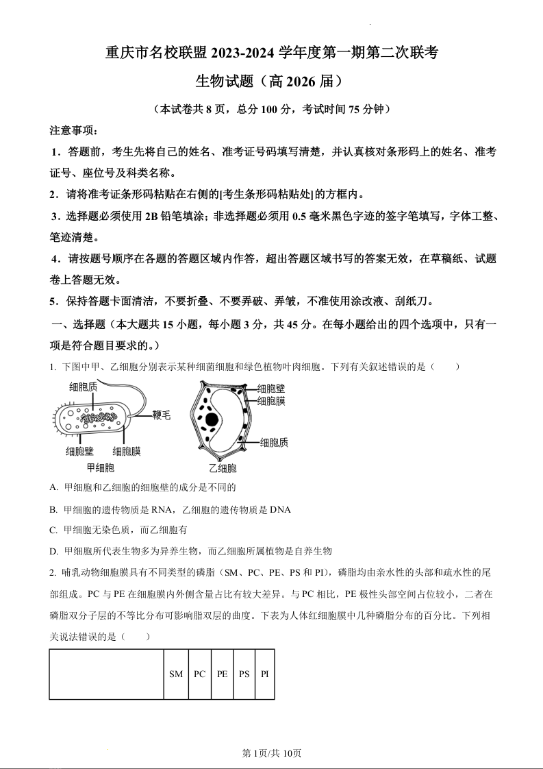 重庆市名校联盟2023-2024学年高一上学期12月联考生物(原卷版)