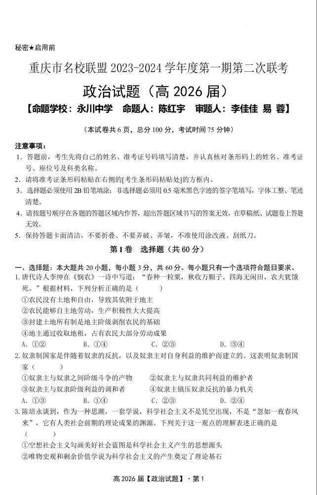 重庆市名校联盟2023-2024学年高一上学期12月联考政治