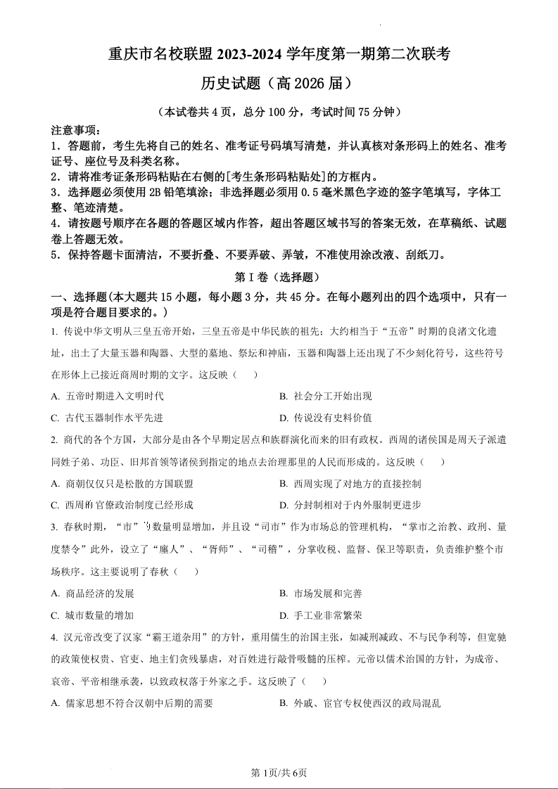 重庆市名校联盟2023-2024学年高一上学期12月联考历史(原卷版)