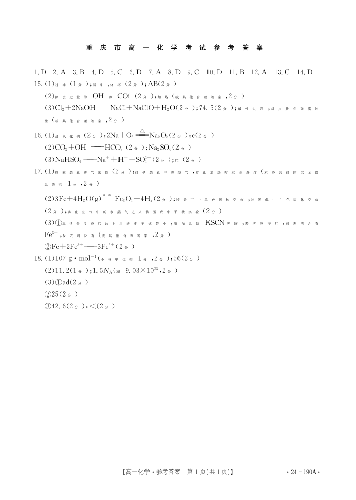重庆市云阳县、梁平区等地 2023-2024学年高一上学期12月月考化学答案