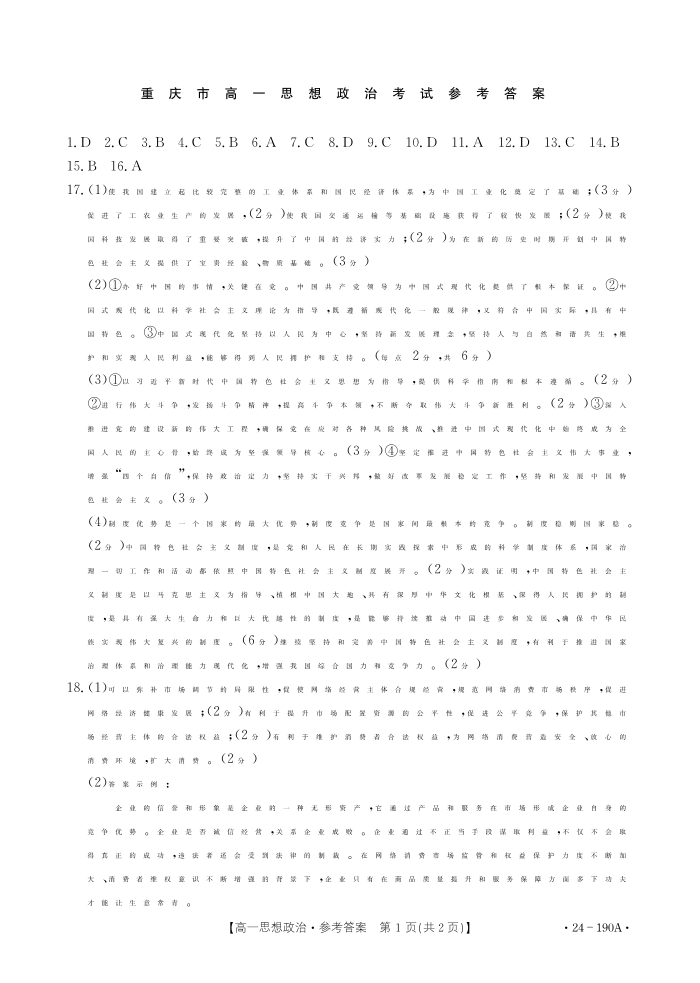 重庆市云阳县、梁平区等地 2023-2024学年高一上学期12月月考政治答案