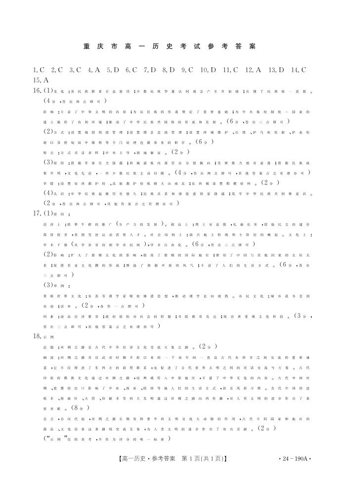 重庆市云阳县、梁平区等地 2023-2024学年高一上学期12月月考历史答案